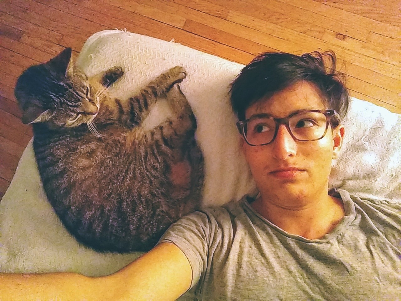 [Overhead shot of me lying next to Wasabi]